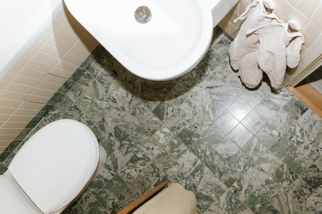 We expanded so we got two toilets, a shower and a bath and at the same time took the opportunity to replace the dull plastic mats and tiles that were from the 90s. Kolmården marble on the floors was an important starting point, the beautiful green color and the life of the stone adds a classic touch that fits well with the pastel colors. We chose to have 10x10 cm tiles of Kolmården marble honed on the floor, and a cream-white standing tile on the walls.