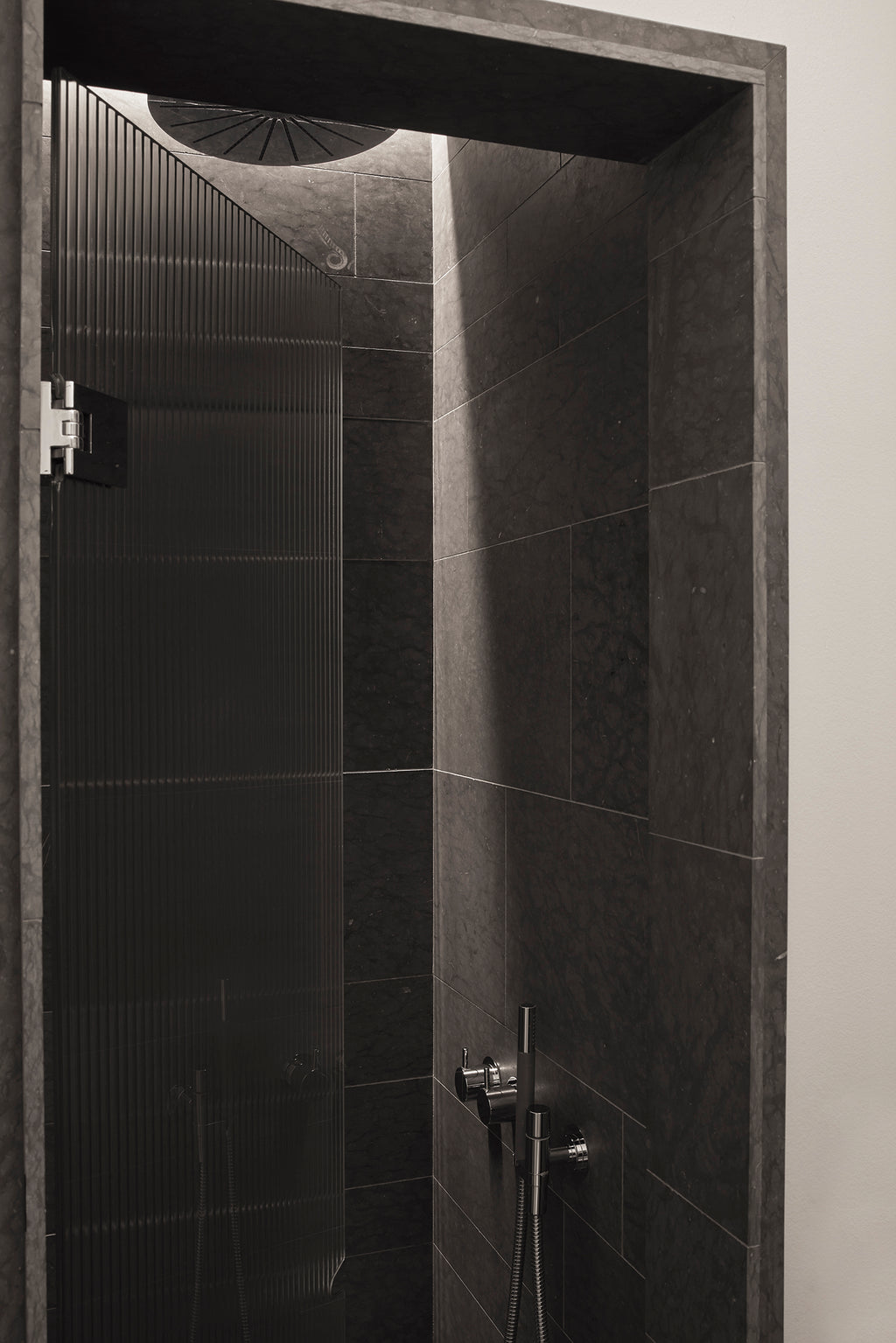 From the very beginning, when I saw the potential of this small space, I was instinctively drawn to a darker stone. The choice landed on Jämtland Gray, as it is a fantastic stone full of fossils with a very beautiful marbling. Both the floor and walls are randomly laid with four different widths of the falling lengths to create a playful arrangement of the stone. Faucets from Vola and chrome details were added to introduce a bit of bling. The large mirrored cabinet, spanning from wall to wall and all the way up to the ceiling, adds space (and storage).